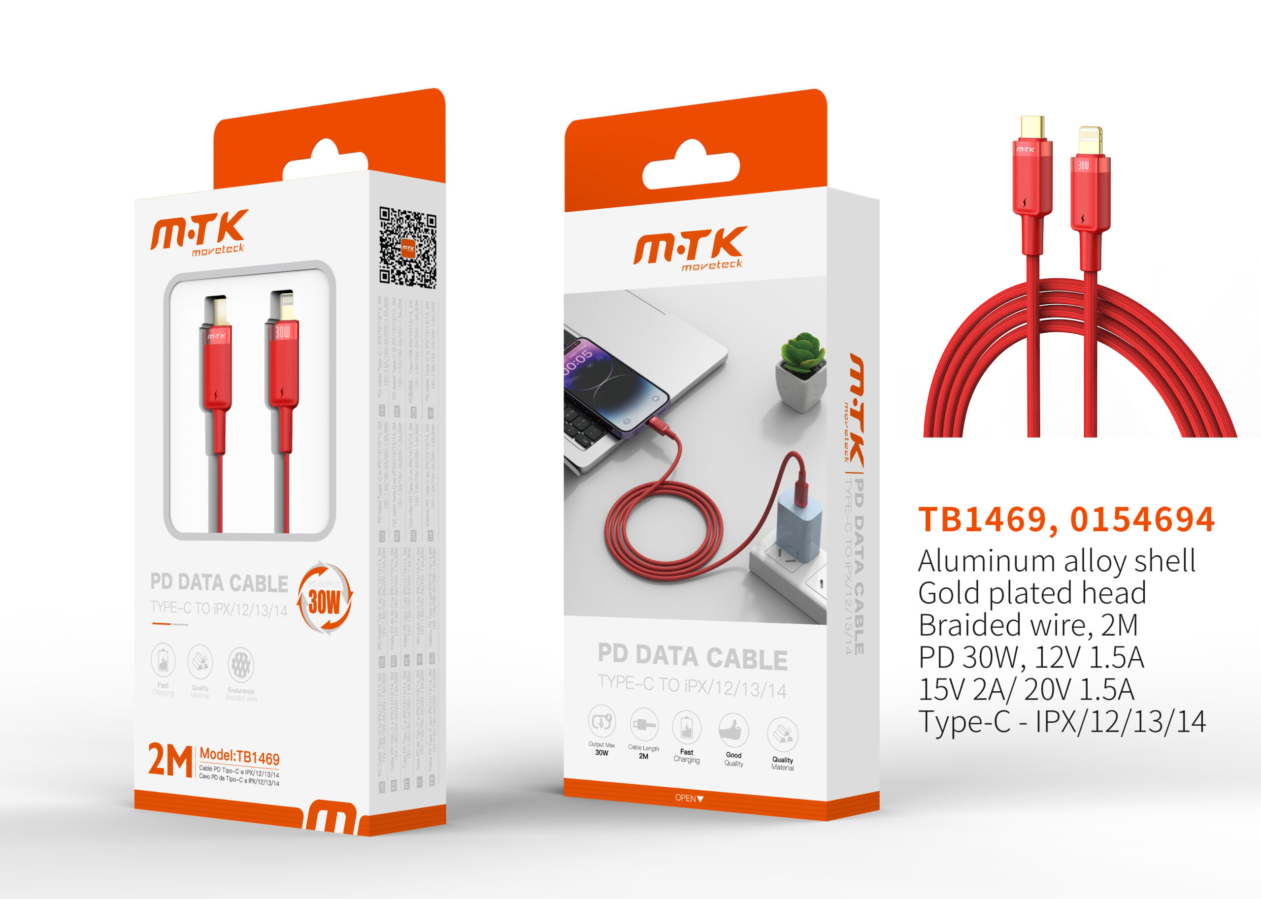 TB1469 RJ Luxury Cable de datos Silas nylon trenzado para Type-C a lightning, Carga Rapida PD, 30W/12V/1.5A, 2M, Rojo
