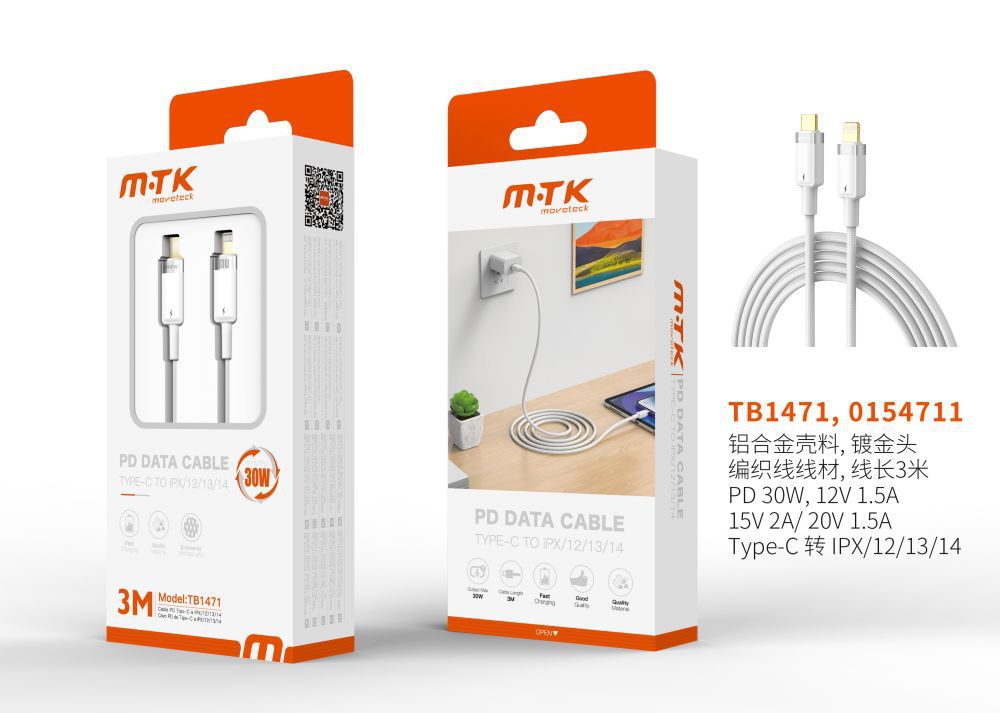 TB1471 BL Luxury Cable de datos Silas nylon trenzado para Type-C a lightning, Carga Rapida PD, 30W/12V/1.5A, 3M, Blanco