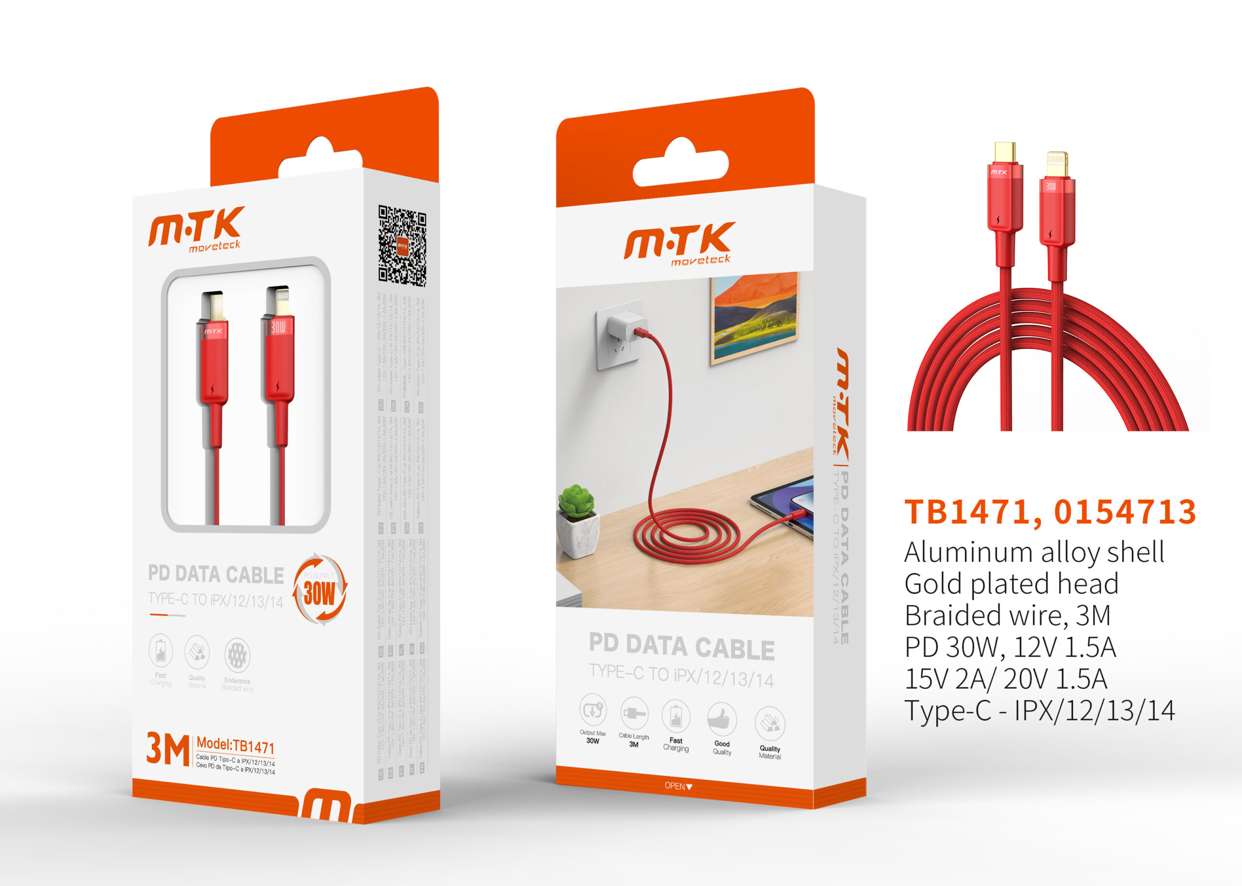 TB1471 RJ Luxury Cable de datos Silas nylon trenzado para Type-C a lightning, Carga Rapida PD, 30W/12V/1.5A, 3M, Rojo