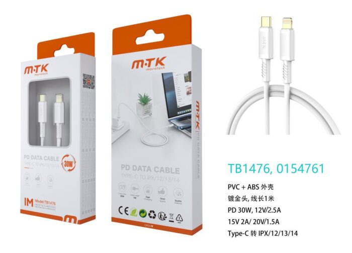 TB1476 BL Luxury Cable de datos Luc para Type-C a Lightning , Carga Rapida PD,30W/12V/2.5A, 1M, Blanco