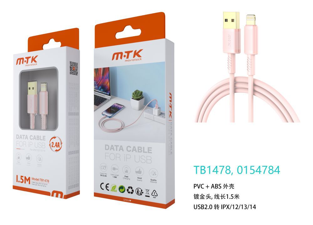TB1478 RS Luxury Cable de datos Luc para Iphone 5-14, 5V/2.4A, 1.5M, Rosa