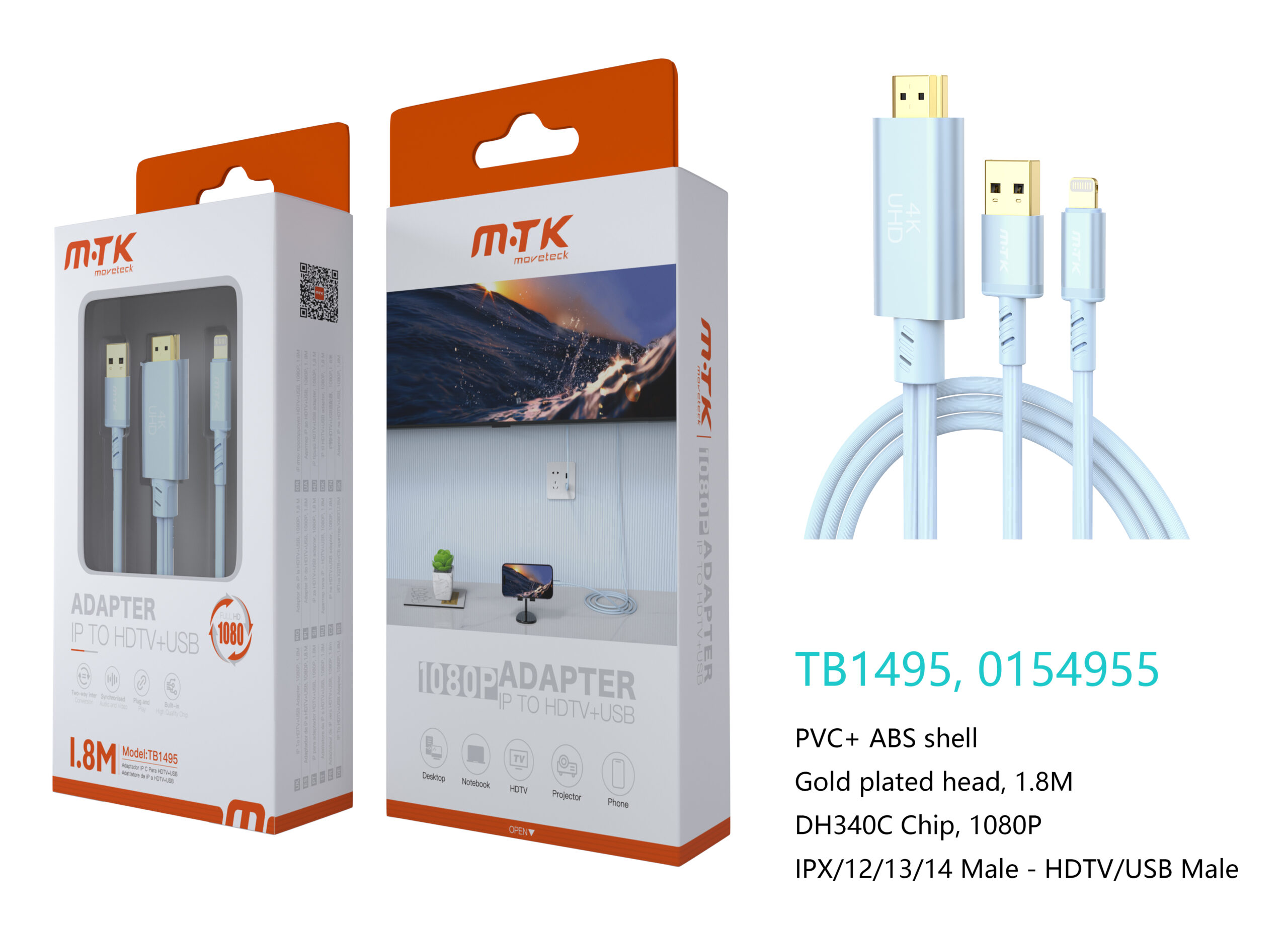 TB1495 AZ Luxury Adaptador 2 en 1 Lightning(Macho) a HDMI+USB 2.0(Macho), 1080P, Cable 1.8M, Azul