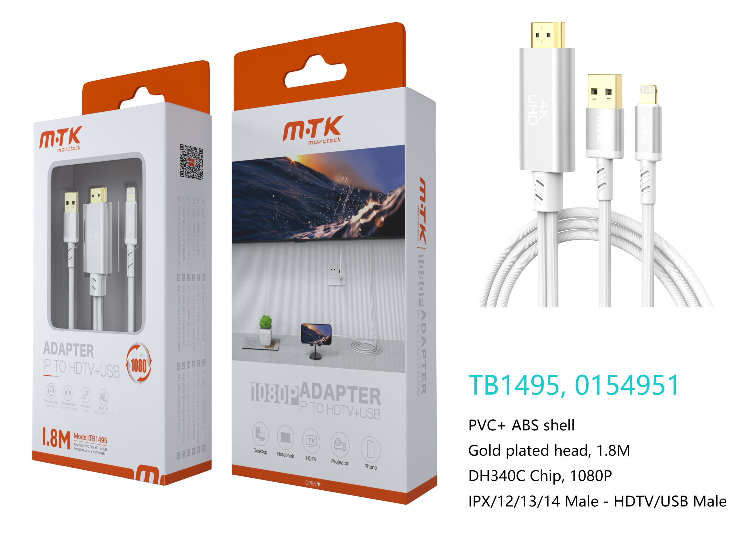 TB1495 BL Luxury Adaptador 2 en 1 Lightning(Macho) a HDMI+USB 2.0(Macho), 1080P, Cable 1.8M, Blanco