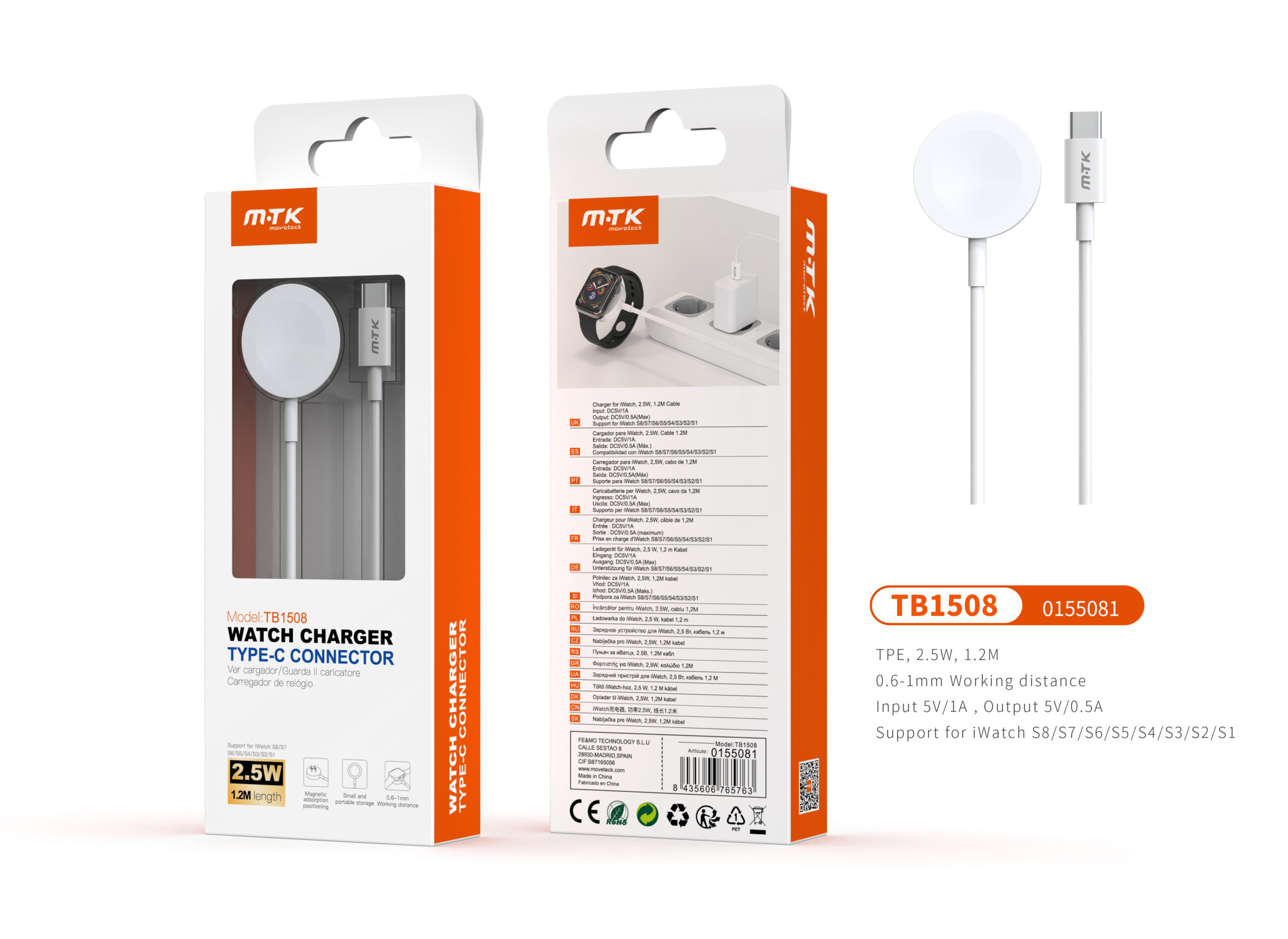 TB1508 BL Cable de Type-C con Cargador Magnetico para I-Watch S1-S9, 2.5W, Cable 1.2M, Blanco