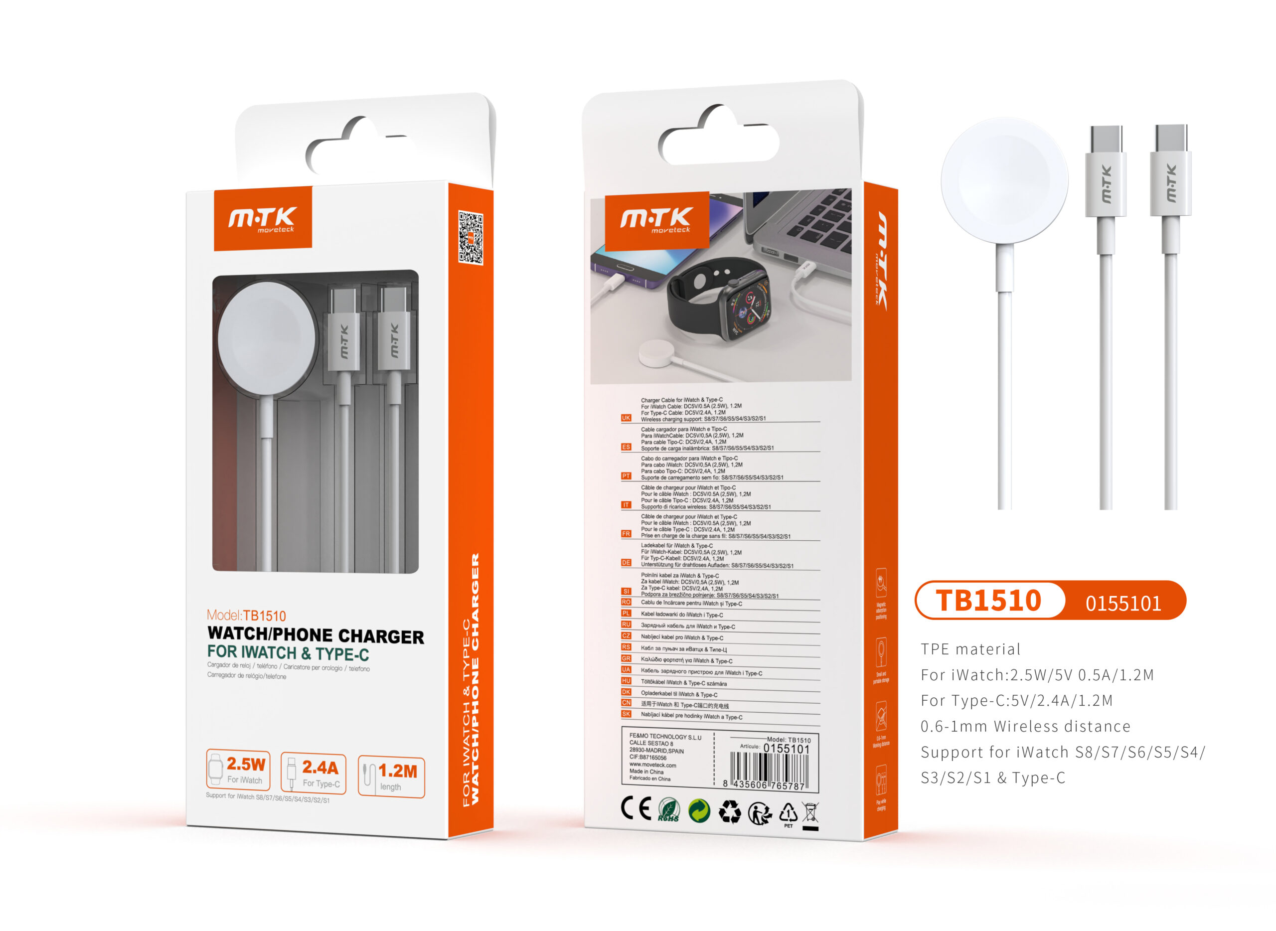 TB1510 BL Cable de Type-C con Cargador Magnetico 2 en 1 para I-Watch S1-S9, 2,5W+Cable Type-C 2.4A, Cable 1.2M, Blanco