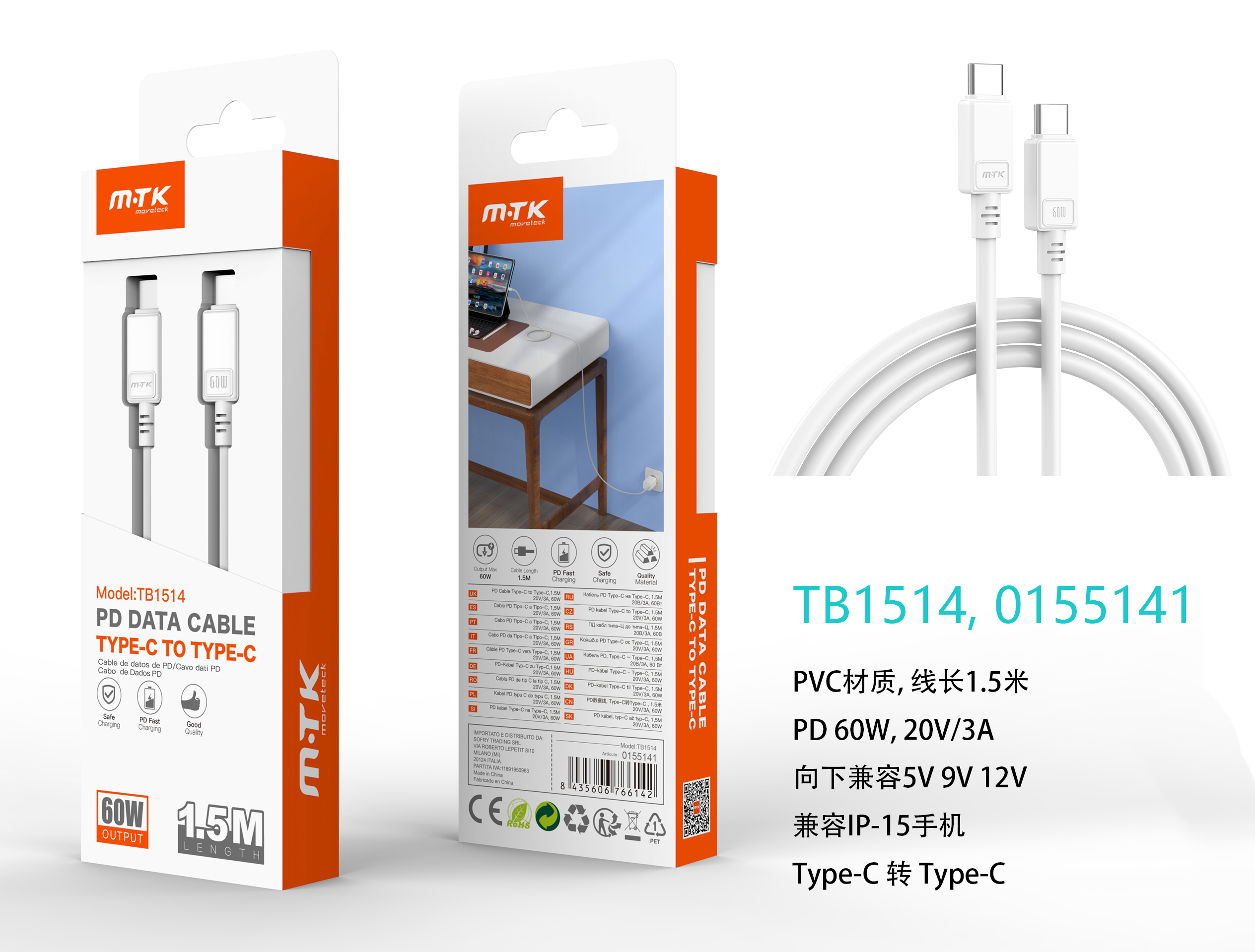TB1514 BL Cable de Datos Lucie Type-C a Type-C, Carga Rapida 60W 20V/3A, Compatible con Apple Type-C, Cable 1,5M ,Blanco