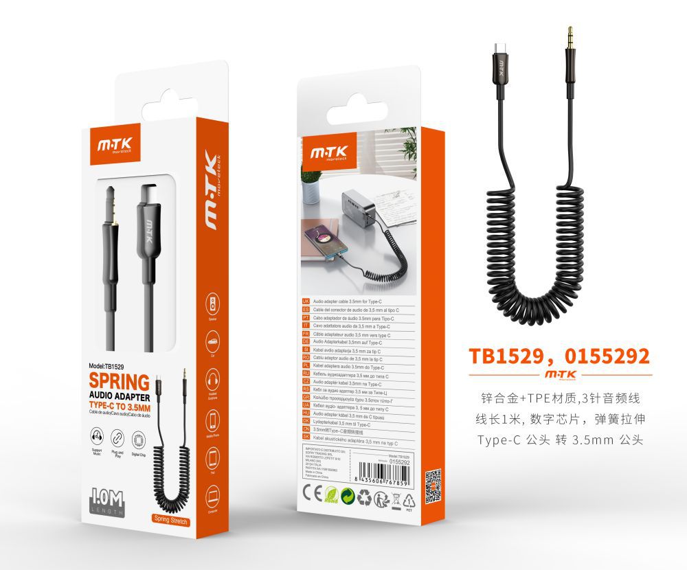 TB1529 NE Cable de Audio en espiral Type-C a 3.5mm Jack, 3Pin, Cable 1m, Negro