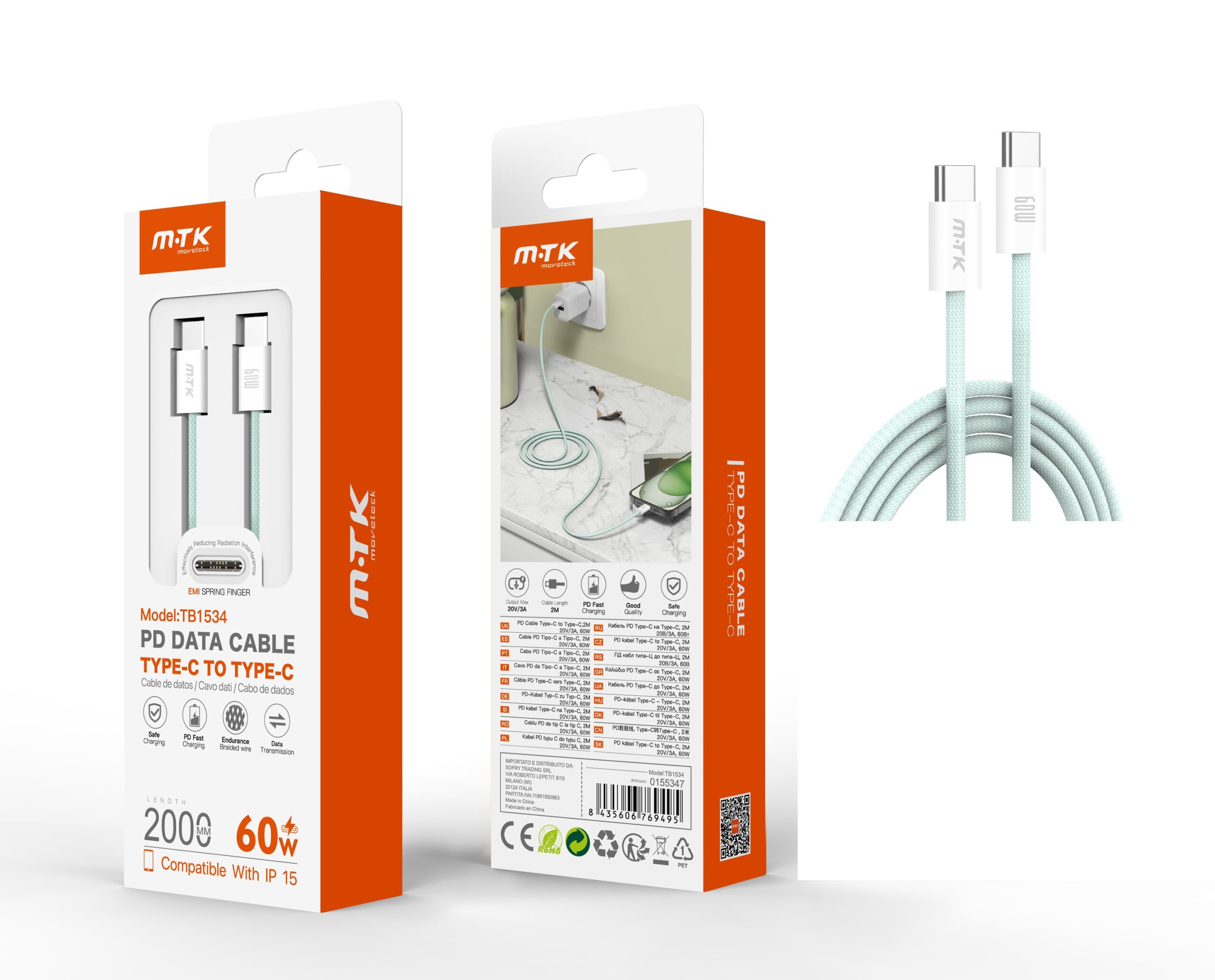 TB1534 VE Cable de datos Coty trenzado para Type-C a Type-C , Compatible con Apple Type-C, 60W/20V/3A, 2M, Verde