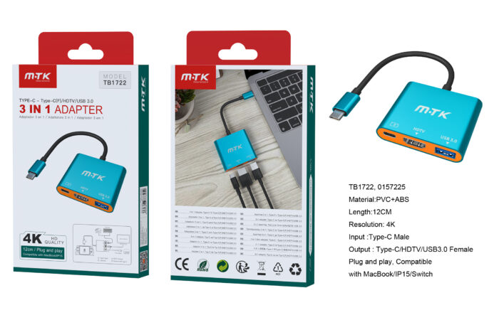 TB1722 AZ Adaptador USB-C 3 en 1, USB-C (Macho) a HDMI/USB 3.0/USB-C (Hembra), 4K Compatible Apple y Switch, Azul