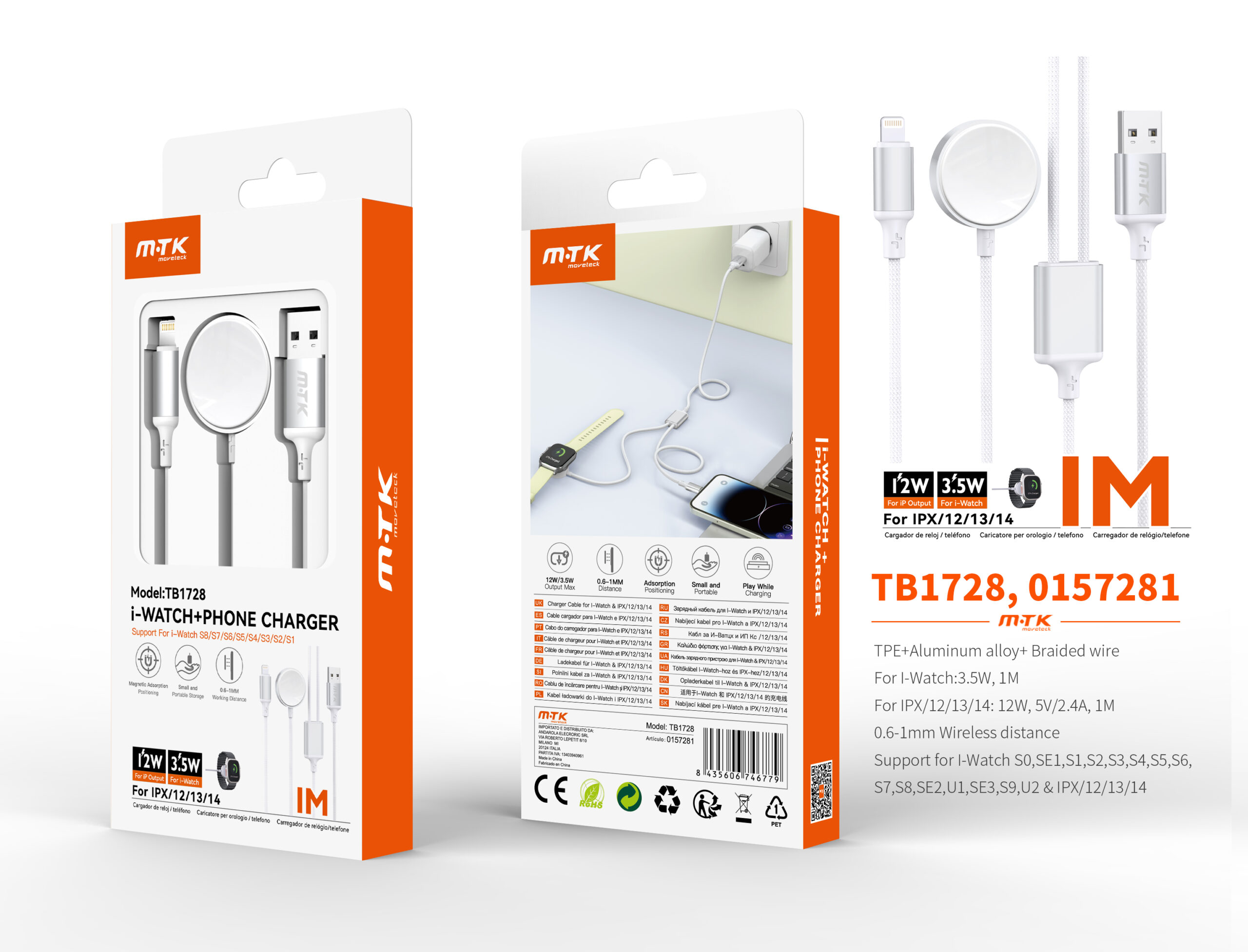 TB1728 BL Cargador Watch 2 en 1,  con cargador Magnetico 3.5W + cable  trenzado Lightning 60w, Cable 1m, Blanco