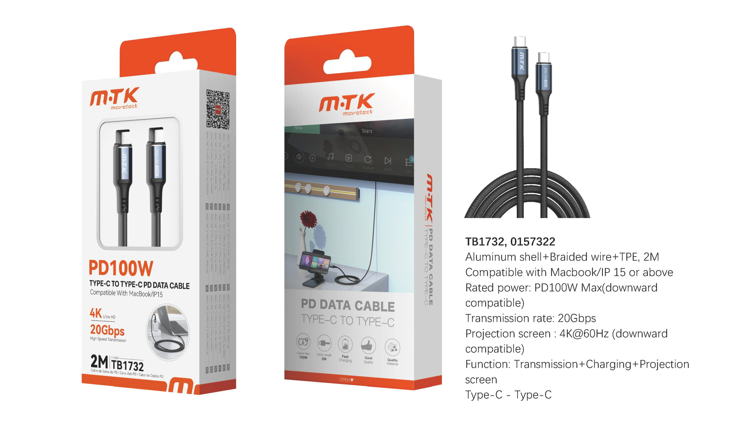 TB1732 NE Luxury Cable de Datos y Videos Trevok aluminio trenzado Type-C a Type-C . 20Gbps/100W/4K/60hz/2M. Compatible con Apple Type-C. Negro