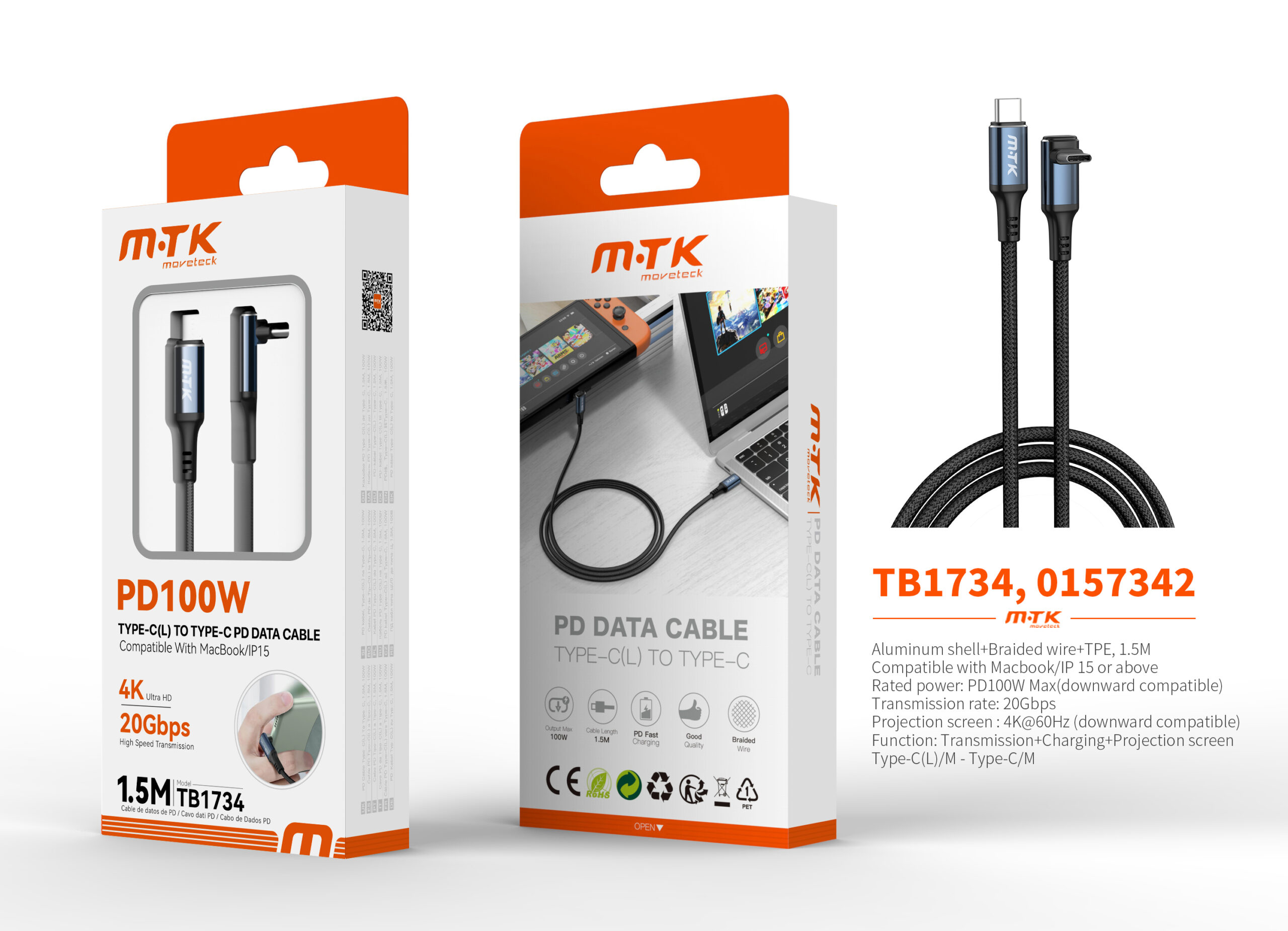 TB1734 NE Luxury Cable de Datos y Videos Trevok aluminio trenzado en L Type-C a Type-C . 20Gbps/100W/4K/60hz/1.5M. Compatible con Apple Type-C. Negro
