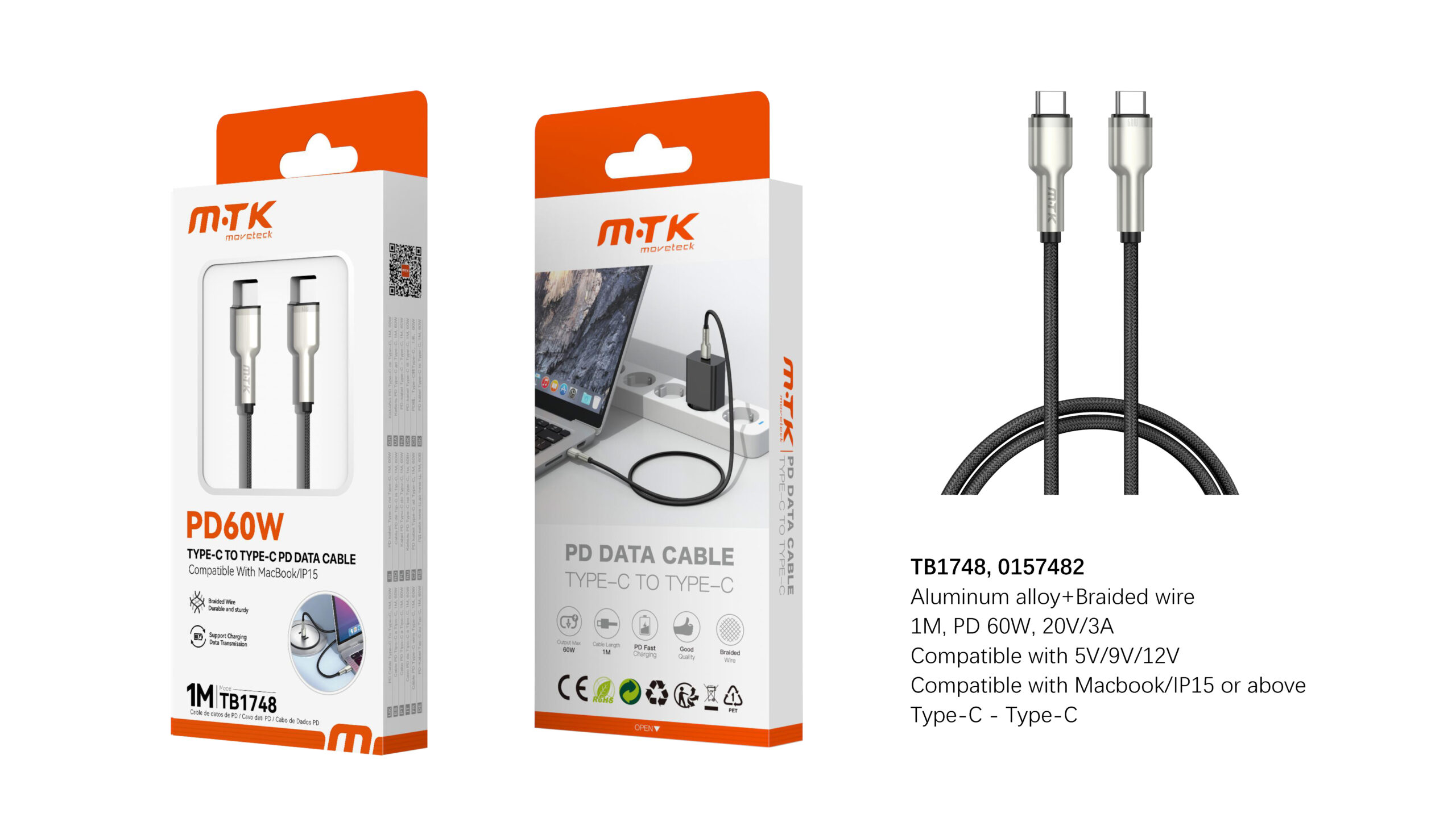 TB1748 Luxury Cable de datos Trelan trenzado para Type-C a Type-C , Compatible con Apple Type-C, 60W/20V/3A, 1M, Negro+Gris