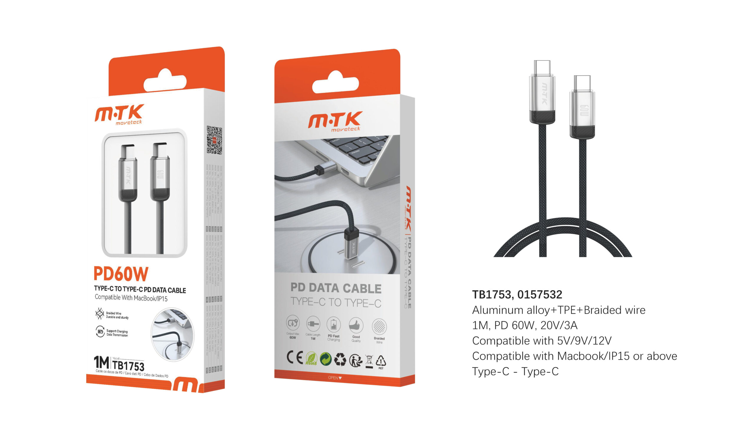 TB1753 Luxury Cable de datos Dralvox trenzado para Type-C a Type-C , Compatible con Apple Type-C, 60W/20V/3A, 1M, Negro+Plata