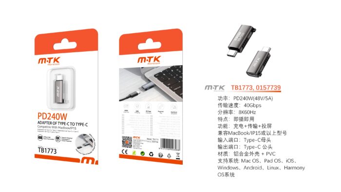 TB1773 GR Luxury Adaptador aluminio dato+carga+transmision de video Type-C a Type-C 240W/48V/5A/40Gbps/8K/60Hz compatible Apple Type-C, Gris