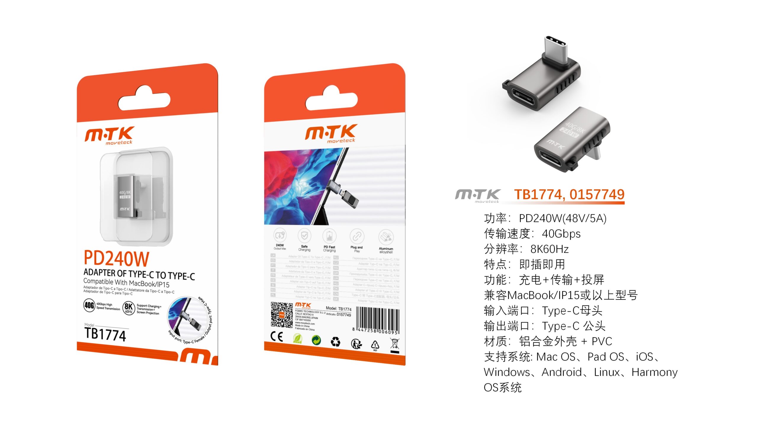 TB1774 GR Luxury Adaptador aluminio en L dato+carga+transmision de video Type-C a Type-C 240W/48V/5A/40Gbps/8K/60Hz compatible Apple Type-C, Gris