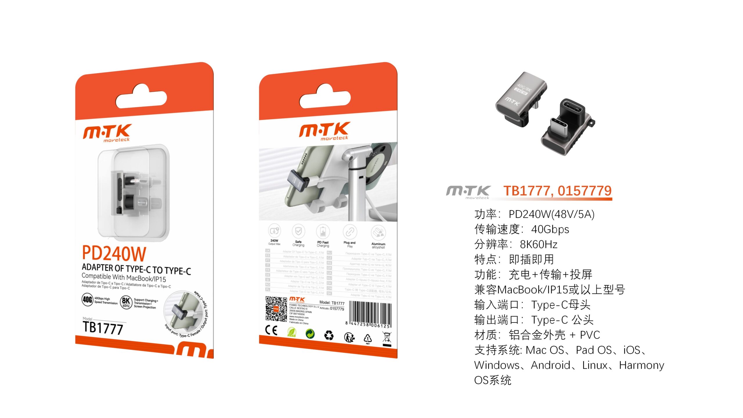 TB1777 GR Luxury Adaptador aluminio en U dato+carga+transmision de video Type-C a Type-C 240W/48V/5A/40Gbps/8K/60Hz compatible Apple Type-C, Gris