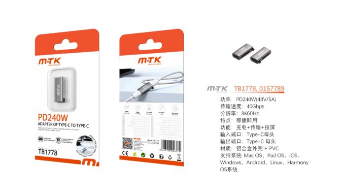 TB1778 GR Luxury Adaptador aluminio dato+carga+transmision de video Type-C a Type-C 240W/48V/5A/40Gbps/8K/60Hz compatible Apple Type-C, Gris