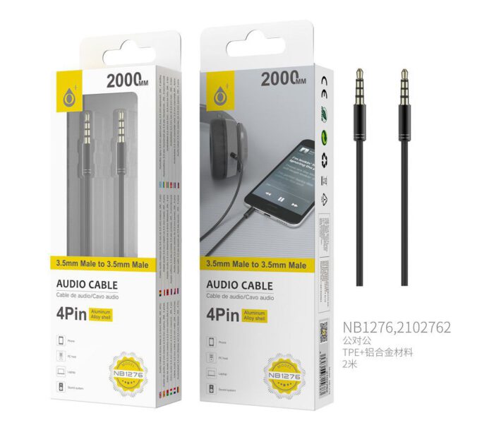 • NB1276 NE Cable de Audio Fox de Aluminio de 3.5mm a 3.5mm Macho a Macho, 4Pin, Longitud 2 M, Negro