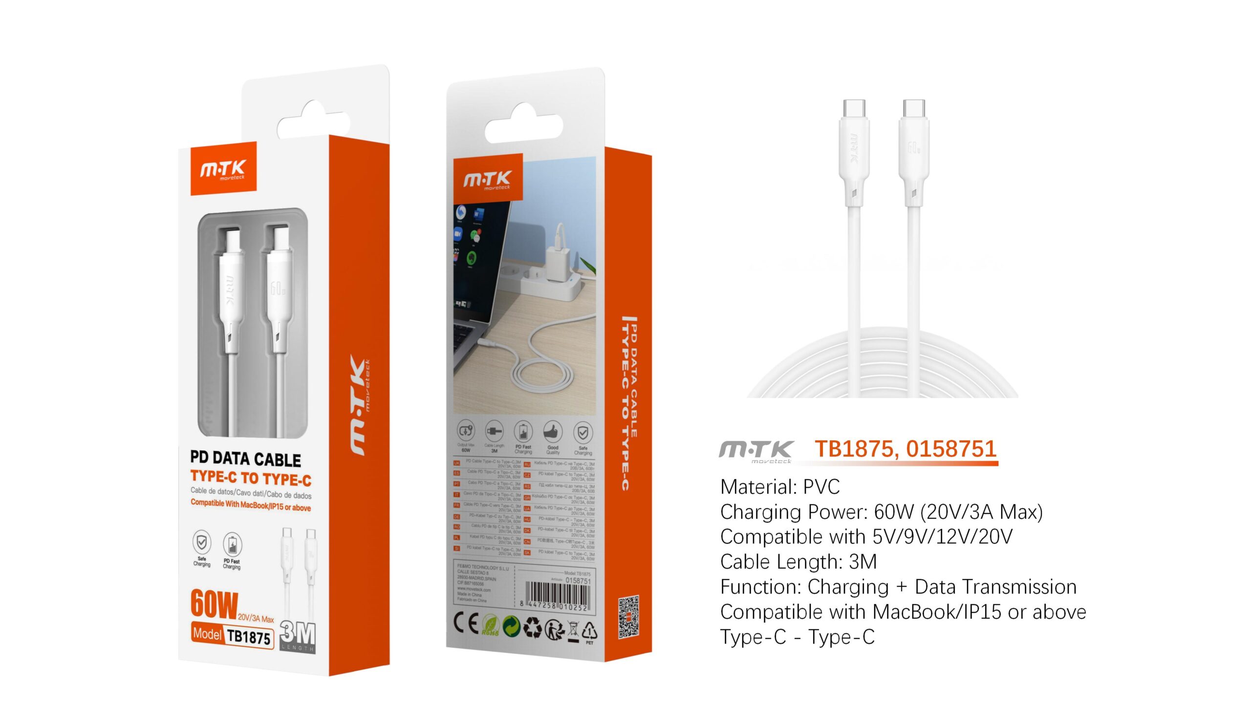 TB1875 BL Cable de Datos Orvion con carga rapida para Type-C a Type-C  60W/20V/3A/3M, Blanco