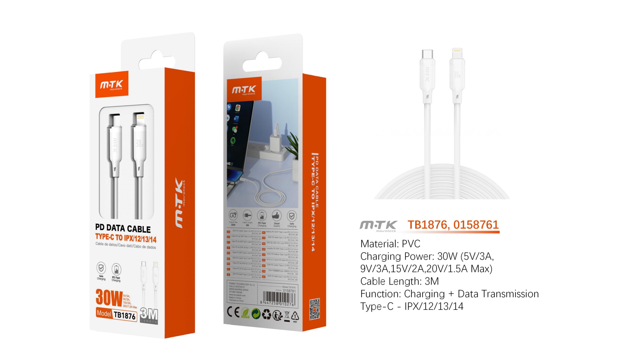 TB1876 BL Cable de Datos Orvion con carga rapida para Type-C a Iphone 30W/20V/1.5A/3M, Blanco