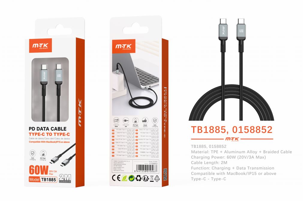 • TB1322 NE Cable de Datos Swift Type-C a Type-C, Carga Rapida 60W 20V/3A ,Cable 1,5M ,Negro