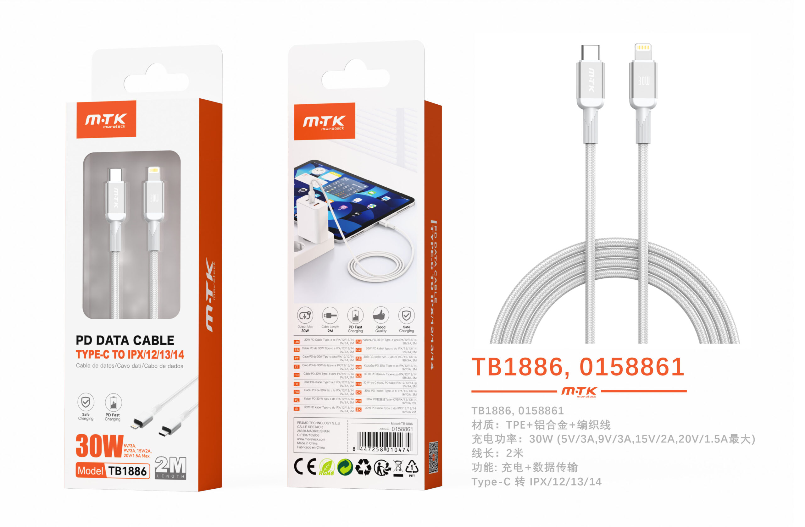 • TB1362 BL Cable de datos Cyril para Type-C a Lightning , Carga Rapida PD, 30W/9V/3.4A, 1M, Blanco
