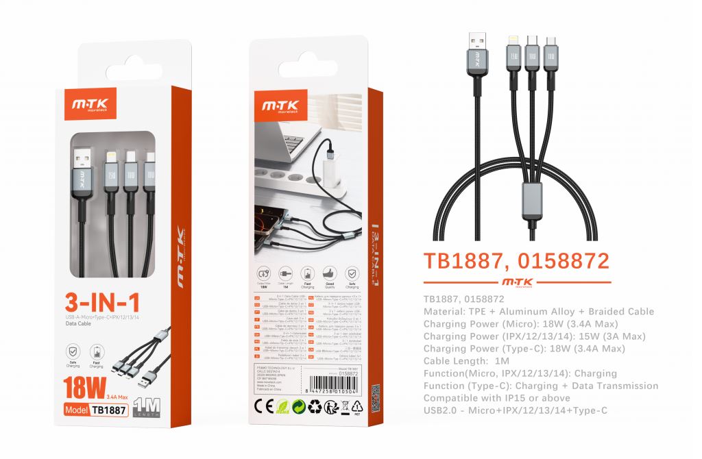 TB1887 NE Cable de datos 3 in 1 Blarkon aluminio trenzado USB-A a Micro 18W+Iphone 15W+Type-C 18W, 1M, Negro