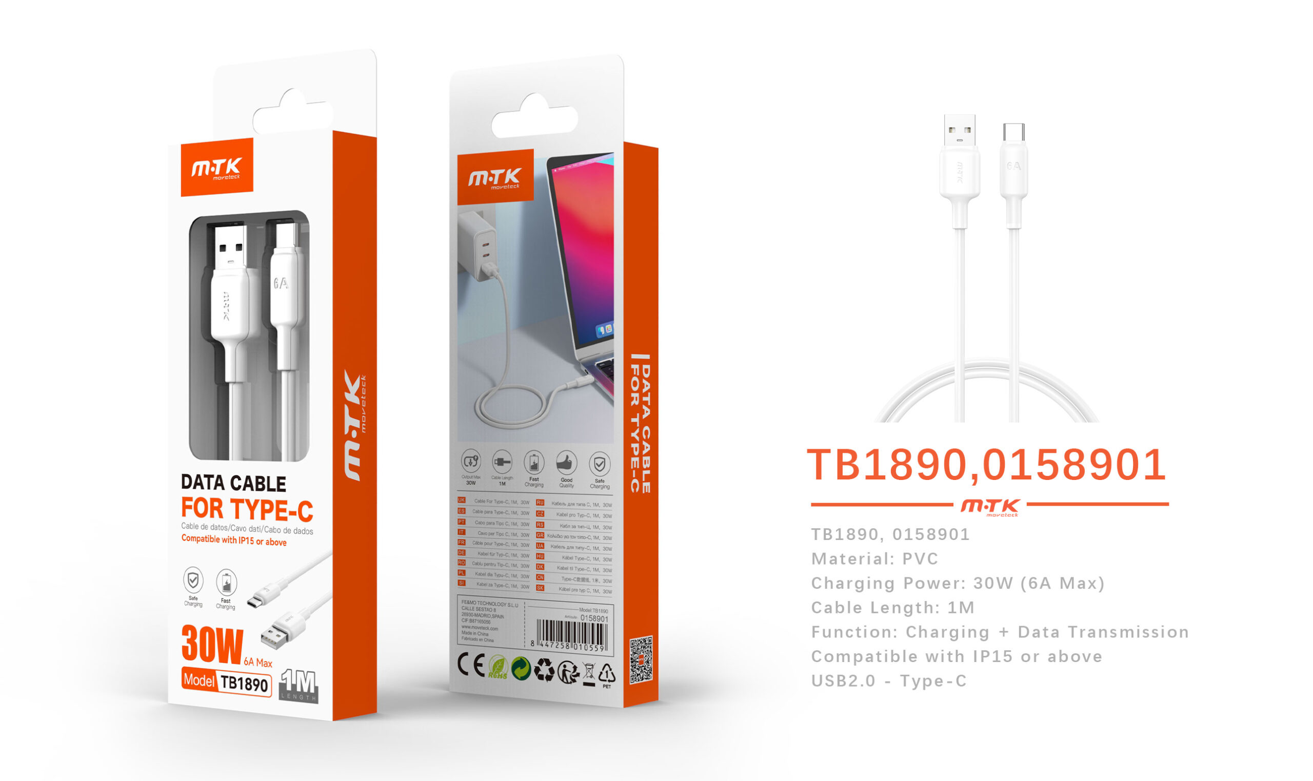 TB1890 BL Cable de Datos Orvion con carga rapida para Type-C 30W/6A/1M, Blanco