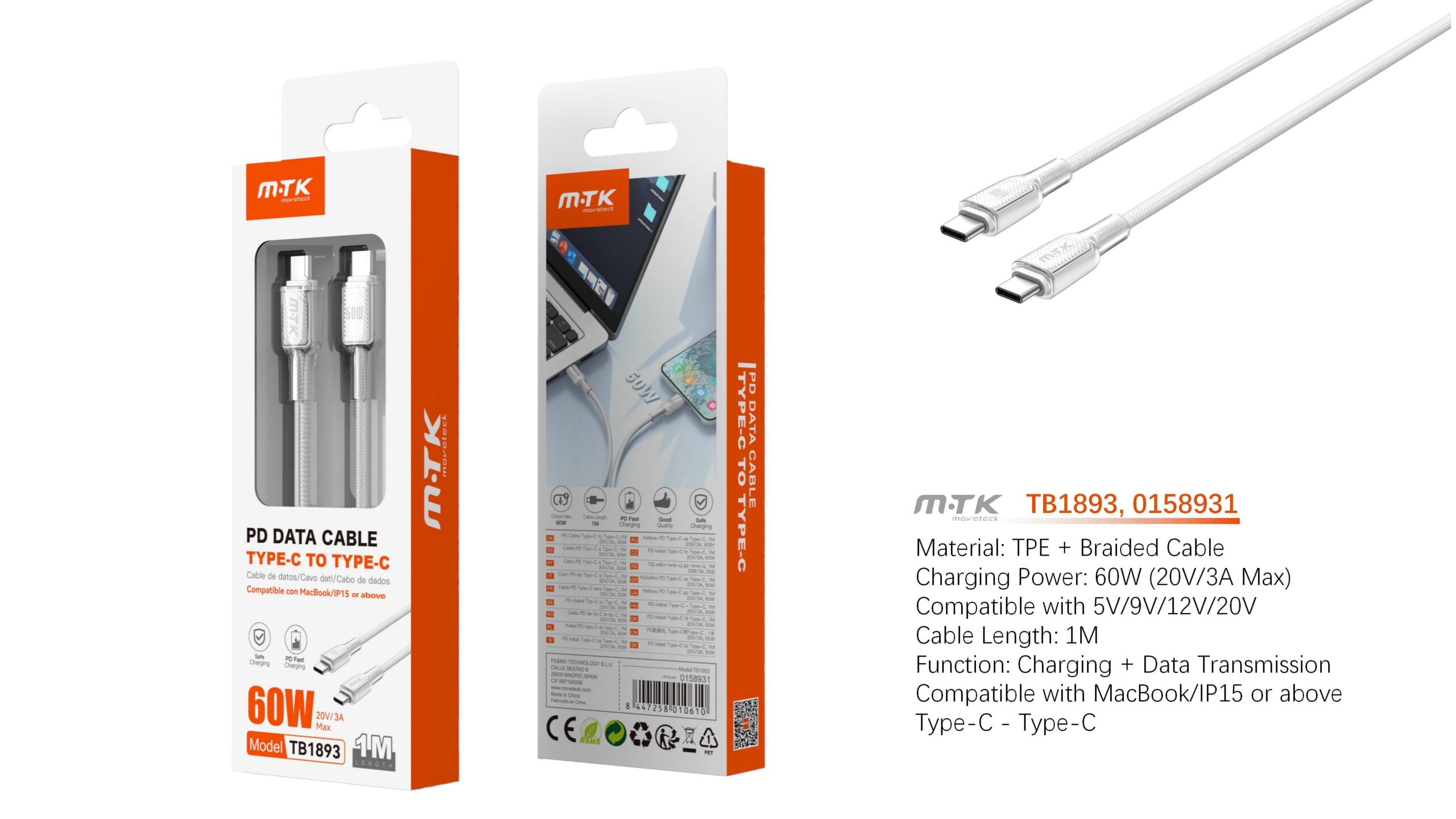TB1893 BL Cable de Datos Lazric trenzado con carga rapida para Type-C a Type-C 60W/20V/3A/1M, Blanco