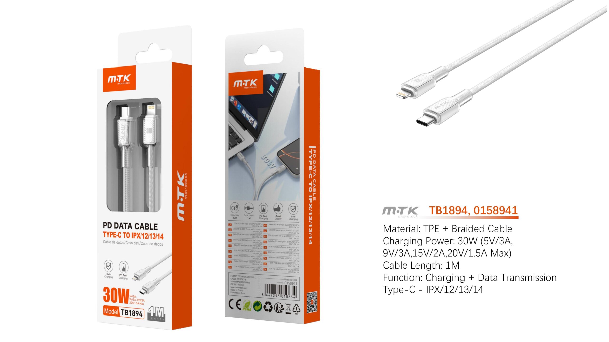 TB1894 BL Cable de Datos Lazric trenzado con carga rapida para Type-C a Iphone 30W/20V/1.5A/1M, Blanco