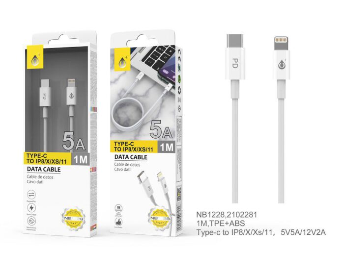 • NB1475 BL Cable de datos Finn para Type-C a Lightning , Carga Rapida PD,30W/9V/3.4A, 1.5M, Blanco