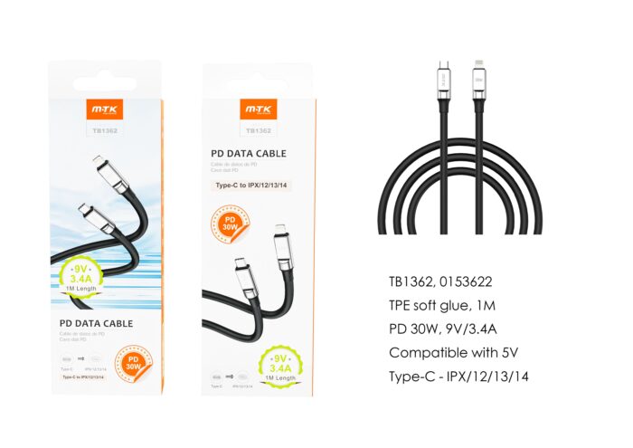 TB1898 NE Cable de Datos Caldris con carga rapida para Type-C a Iphone 30W/20V/1.5A/1M, Negro