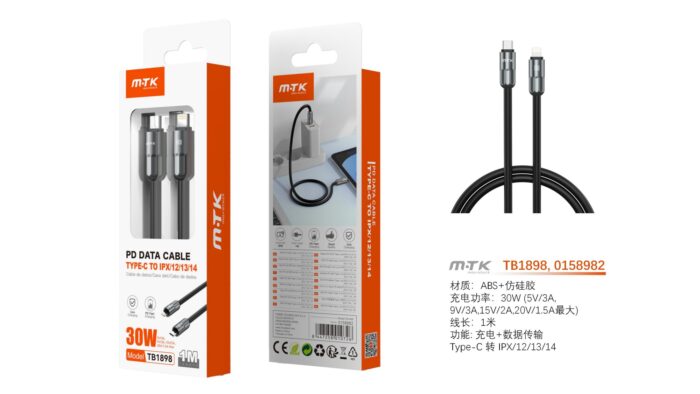 • TB1368 NE Cable de datos TPE para Type-C a Lightning , Carga Rapida PD, 30W/9V/3.4A, 1M, Negro