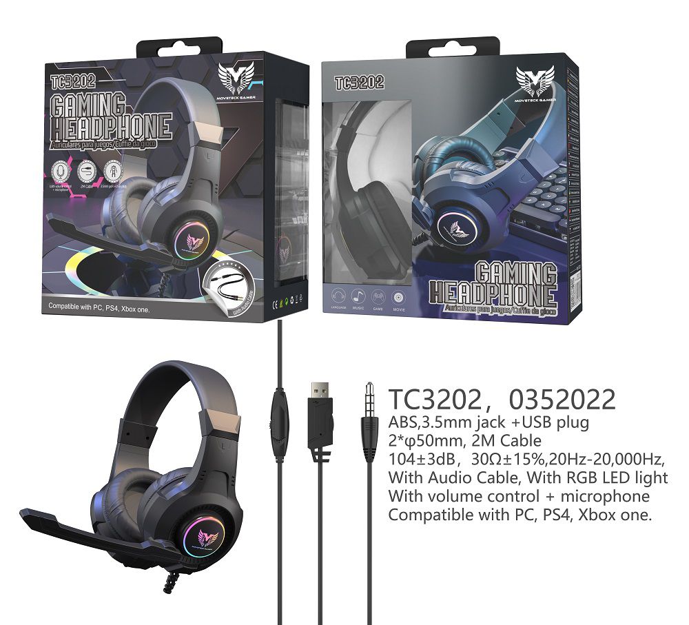 TC3202 NE Auriculares Casco Gaming con Micrófono y Control de volumen, Luz RGB colorines, Adaptador de Jack incluido, Compatible con PC, PS4, Xbox On