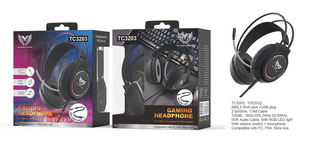 TC3203 NE Auriculares Casco Gaming con Micrófono y Control de volumen, Luz RGB colorines, Adaptador de Jack incluido, Compatible con PC, PS4, Xbox On