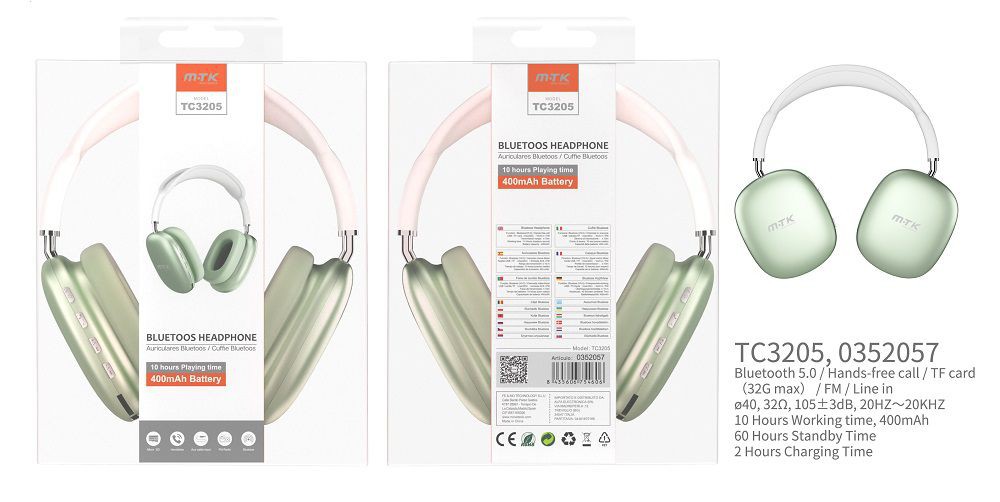 TC3205 VE Auriculares Bluetooth 5.0, Llamadas manos libres, Micro SD/TF (32GB Max), Radio FM, con Cable de entrada aux, 400mAh, Verde
