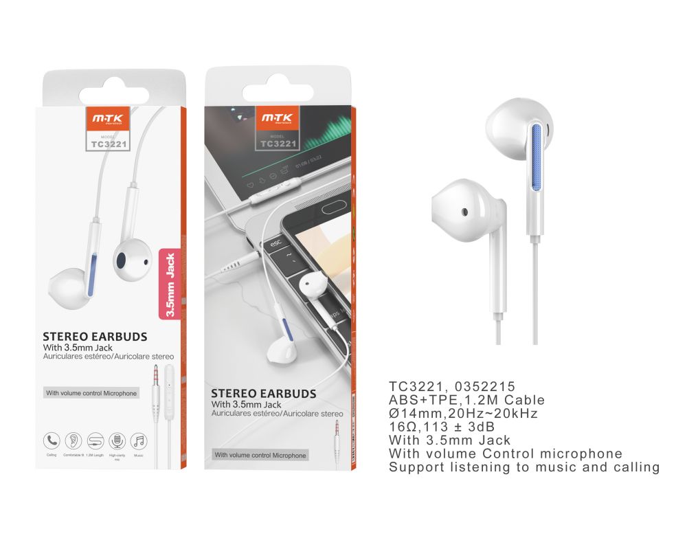 TC3221  Auricular  Sylvie con Microfono y  Boton multifuncion, Soporta llamada y Musica, Cable 1.2m, Blanco+Azul