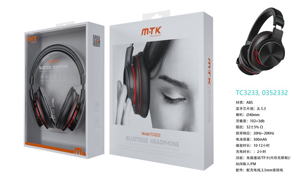 TC3233  Luxury Auricular Bluetooth 5.3, Soporta Mano libre/FM/TF(Sin limitacion de Memoria)/Entrada de Audio, Bateria 300mAh, Negro+Rojo