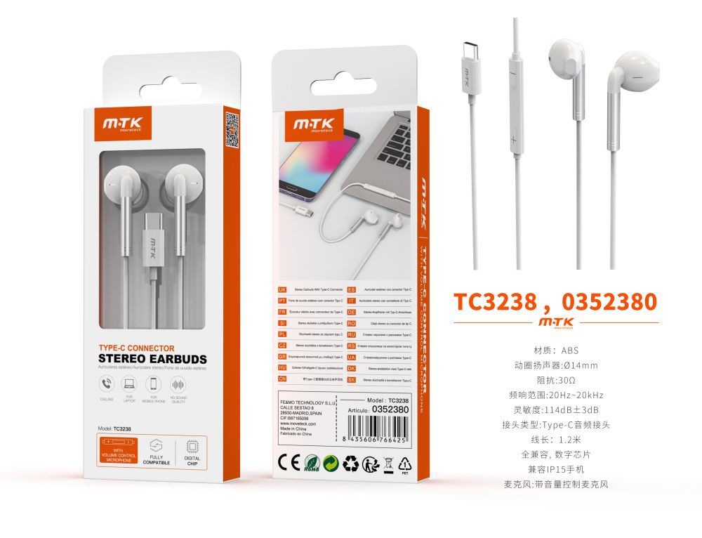 TC3238 BL Auricular TYPE-C Anton con Microfono y  Control de Volumen, Soporta llamada y Musica, Compatible con Apple Type-C, Cable 1.2m, Blanco