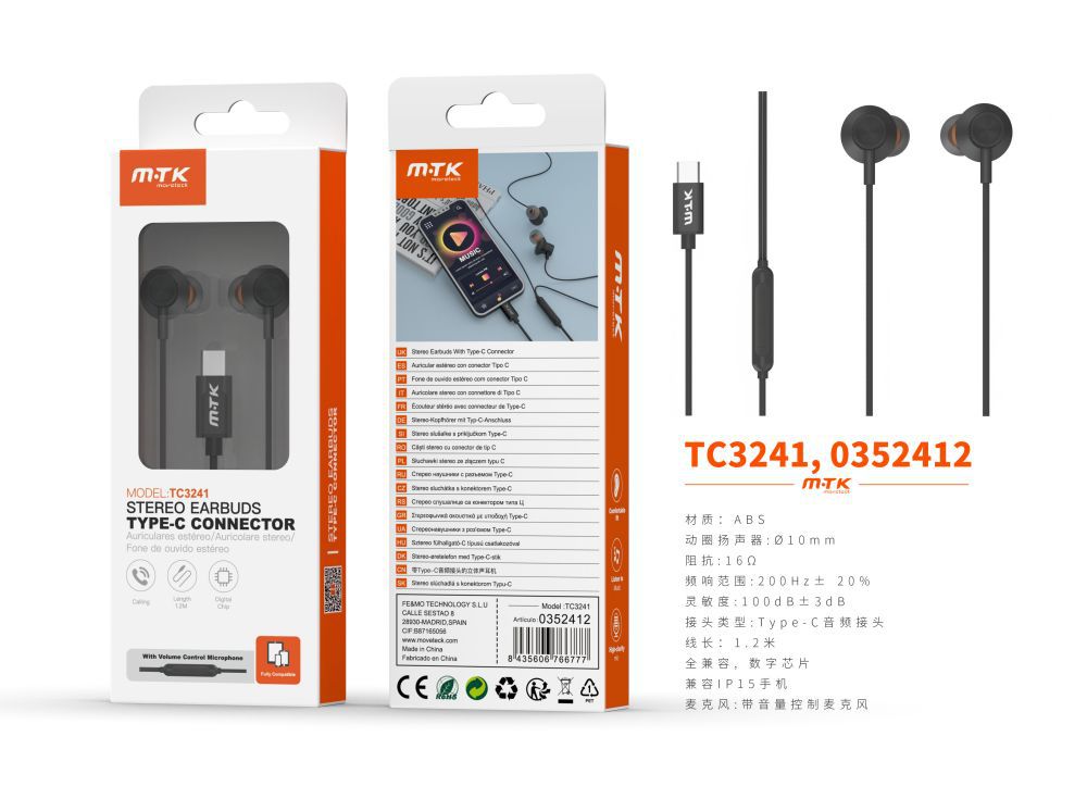 TC3241 NE Auricular TYPE-C Adal con Microfono y  Control de Volumen, Compatible con Apple Type-C, Soporta llamada y Musica, Cable 1.2m, Negro