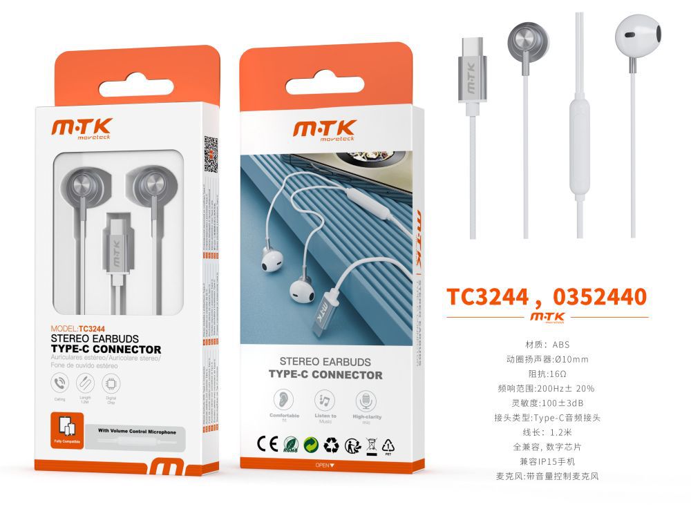 TC3244 BL luxury Auricular  Type-C Orson con Microfono y  Control de Volumen, Compatible con Apple Type-C, Soporta llamada y Musica, Cable 1.2m, Blanco