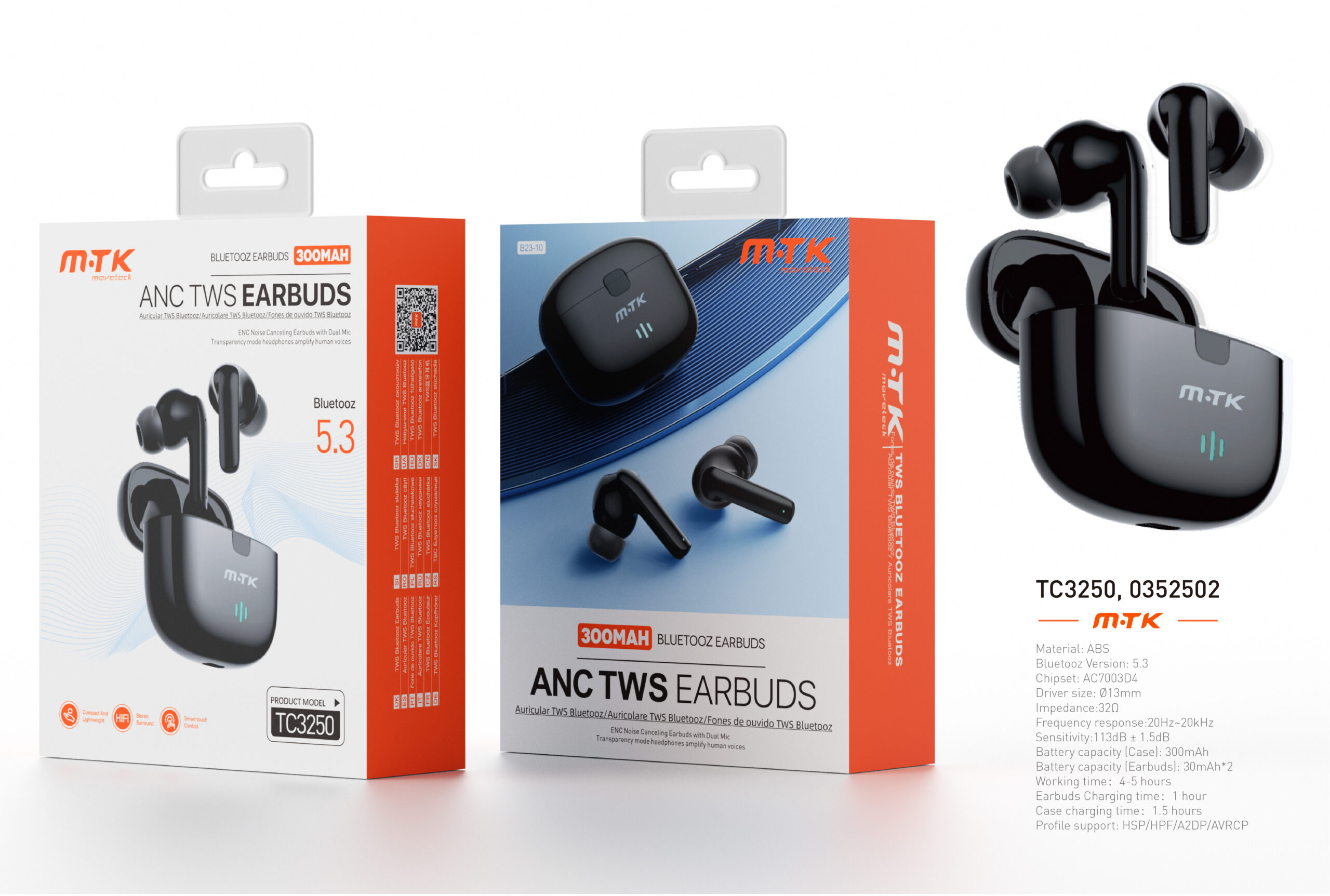 TC3250 NE Auriculares TWS Bluetooth 5.3, Bateria (30mAh*2)Con Estuche Recargable 300mAh, Negro