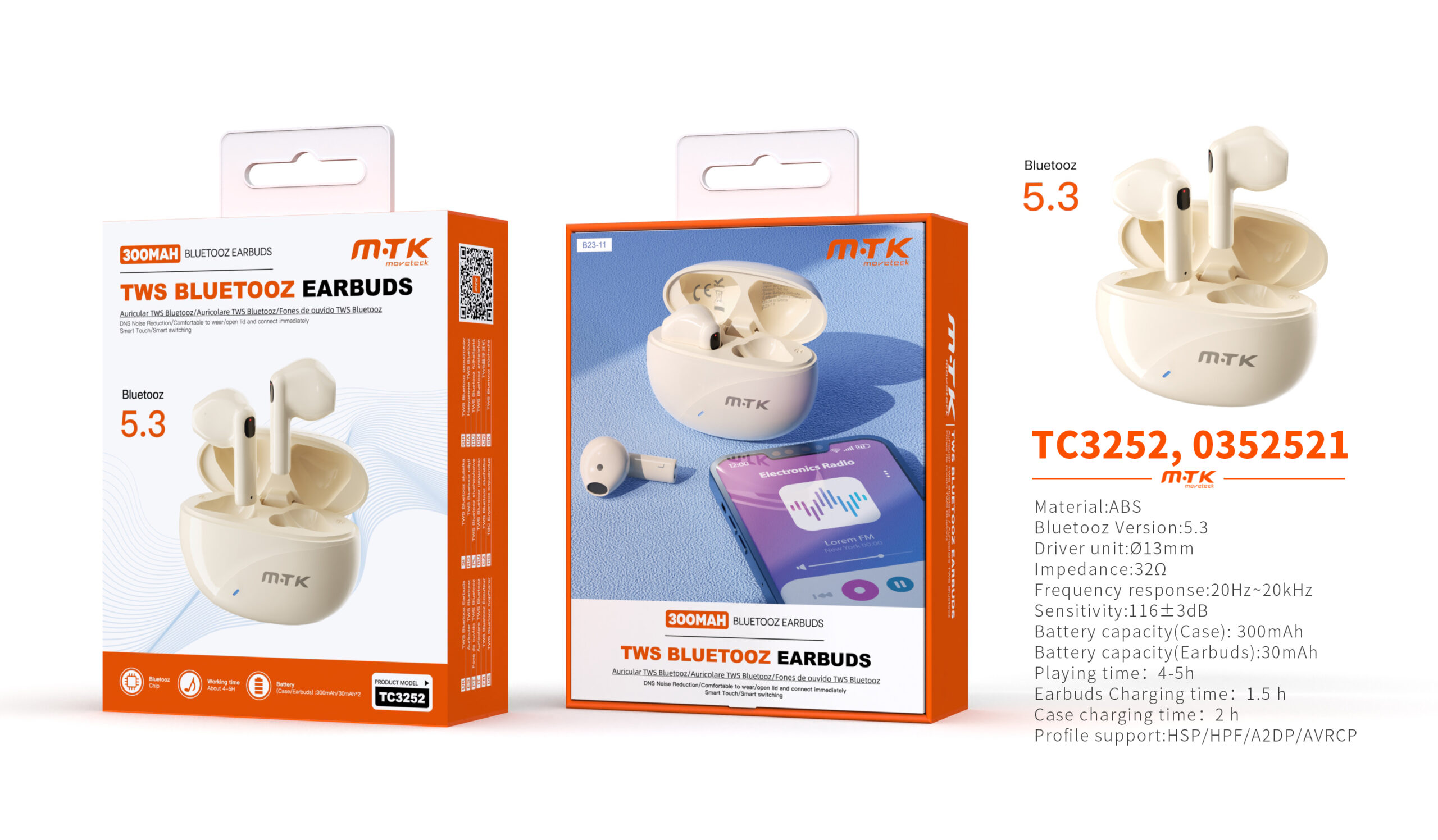 • TC3250 BL Auriculares TWS Bluetooth 5.3, Bateria (30mAh*2)Con Estuche Recargable 300mAh, Blanco