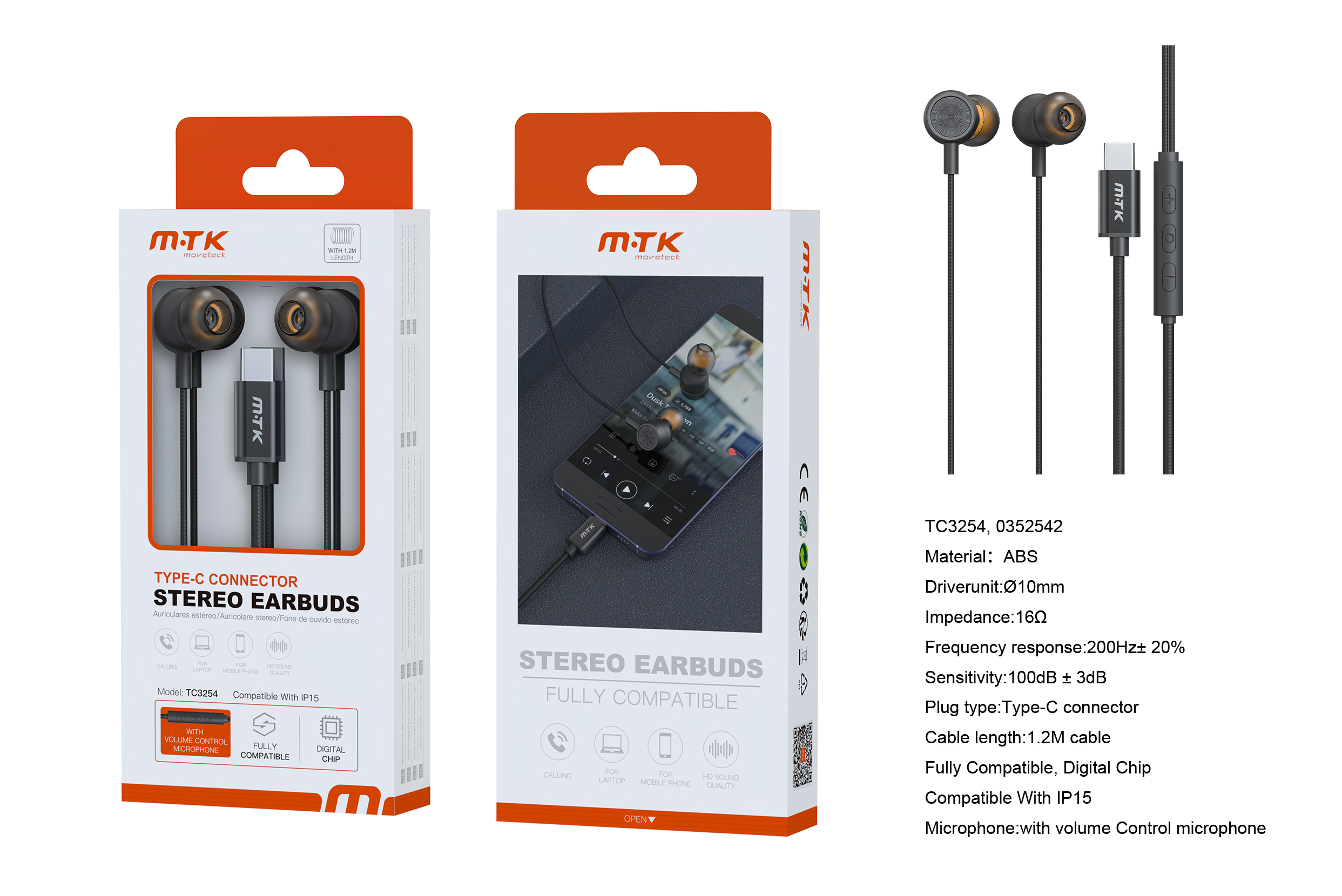 TC3254 NE luxury Auricular  Type-C Ezra con Microfono y  Control de Volumen, Compatible con Apple Type-C, Soporta llamada y Musica, Cable 1.2m, Negro