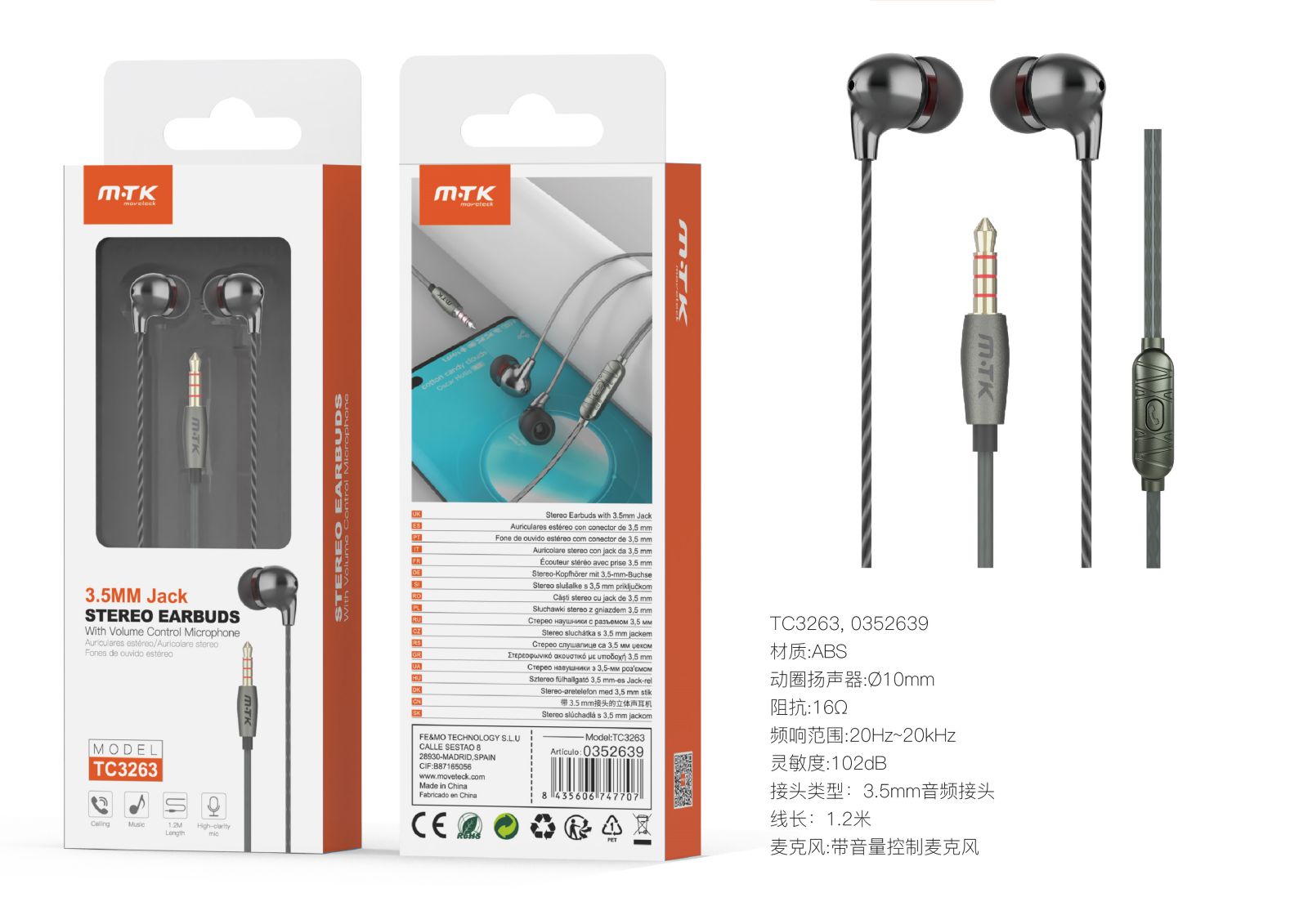 • NC3189 RS Auriculares Ava ,con Microfono, Soporta Control de Volumen y Boton multifunciones, 1.2m,