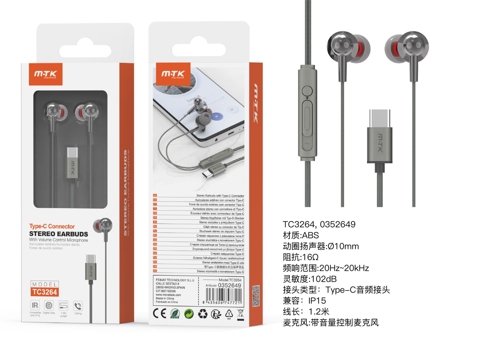 • NC3252 NE Auricular TYPE-C Ria con Microfono y Control de Volumen, Compatible con Apple Type-C, Soporta llamada y Musica, Cable 1.2m, Negro