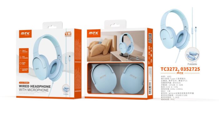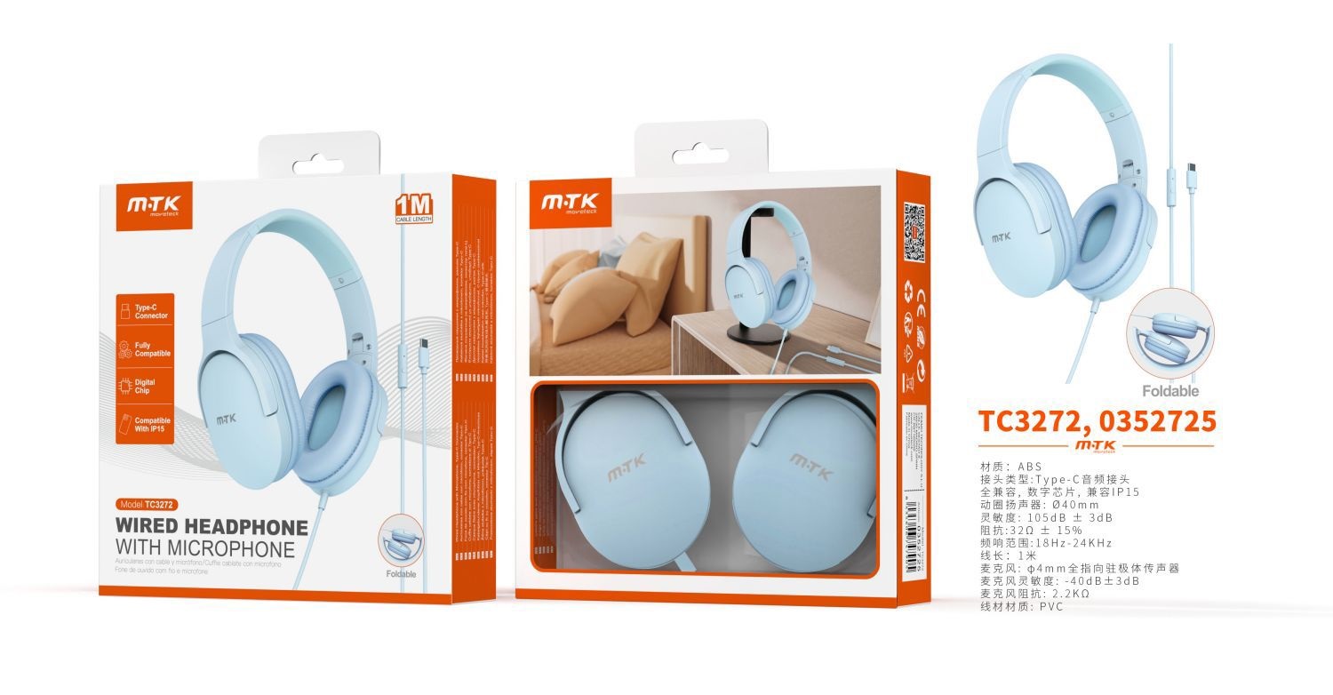 TC3272 AZ Auriculares Casco Zor plegable con Cable Type-C y microfono, Cable 1.2m,Soporta apple, Azul
