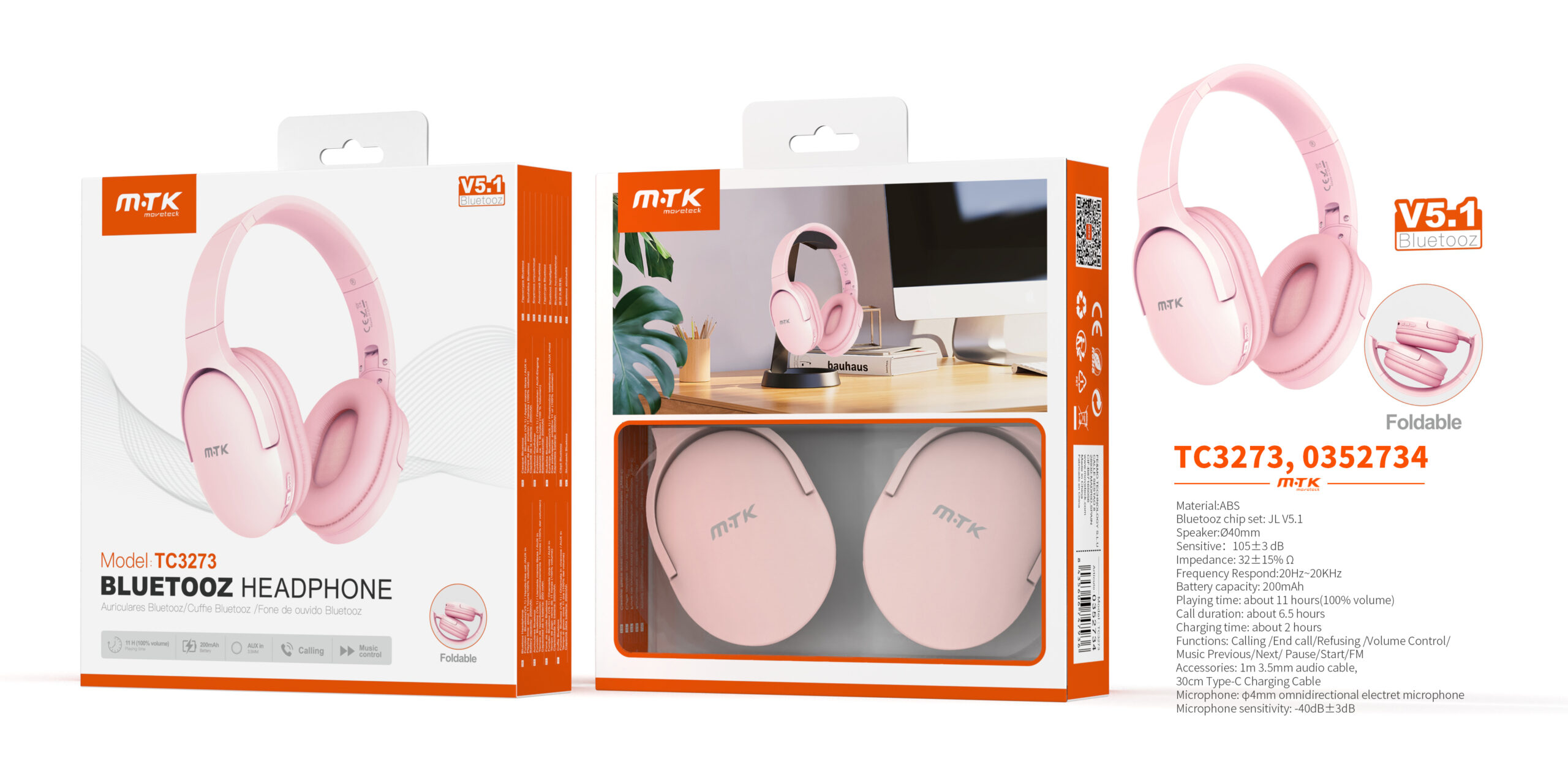 TC3273 RS Auriculares Casco Zor plegable con bluetooth 5.1 y microfono, Btaria 200mAh, Rosa