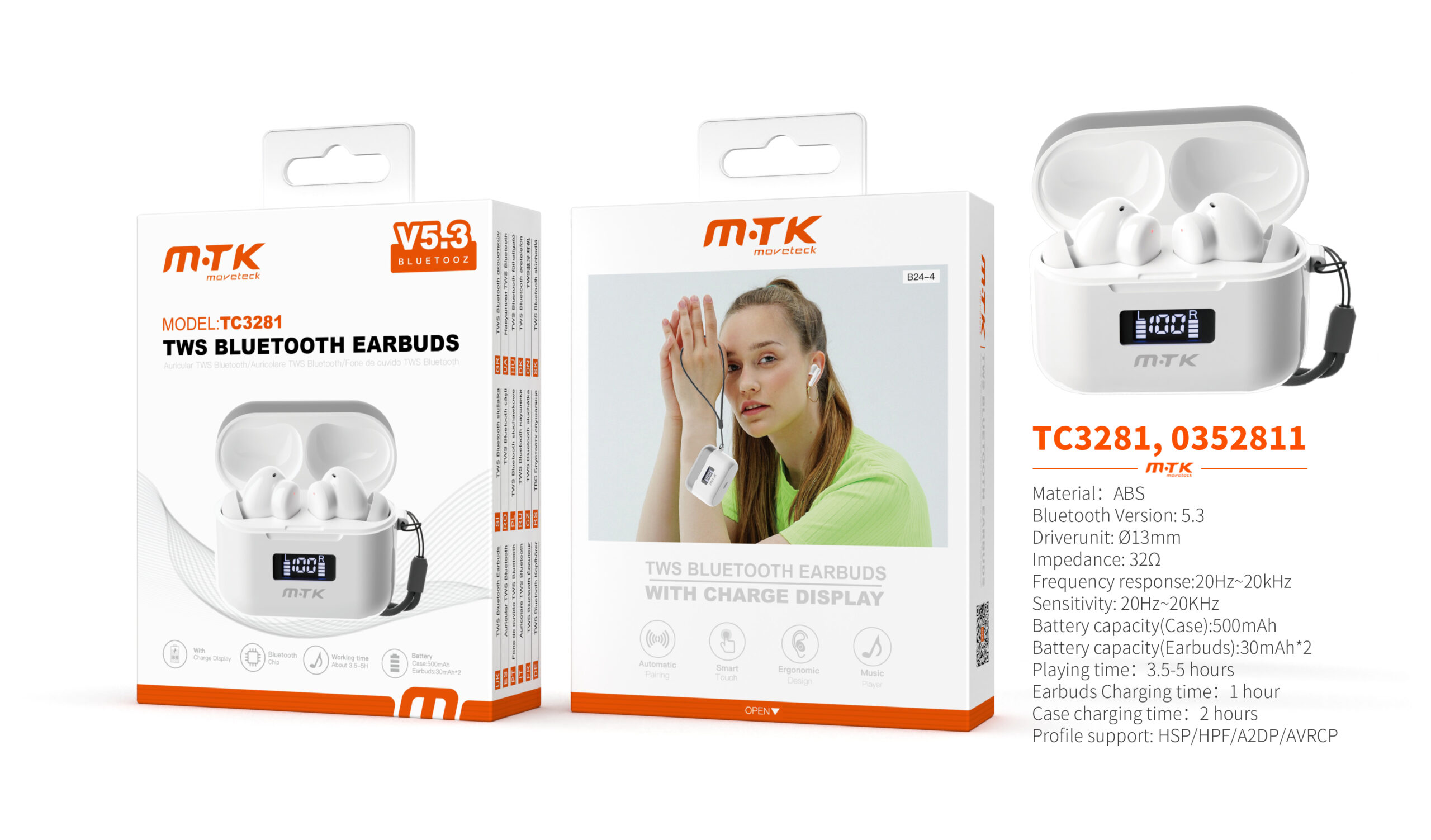 • TC3251 BL Auriculares TWS Bluetooth 5.3, Bateria (25mAh*2)Con Estuche Recargable 300mAh, Blanco